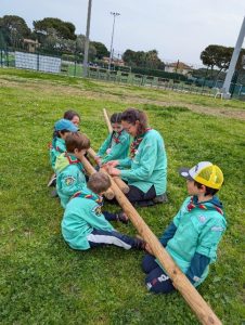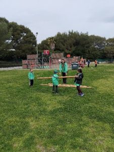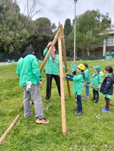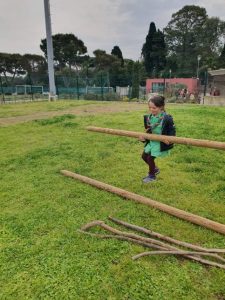 Et pour commencer, nous avons appris à construire une cabane, comme Marie Kingsley quand elle devait installer son campement. Cela nous prépare aussi au grand camp de cet été. Il a fallu porter les poteaux, les assembler avec les nœuds que nous avions appris et d’autres encore, puis monter la structure… et à la fin, il fallait tester sa solidité !!!