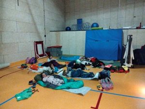 La soirée est passée tellement vite après cela !! Nous avons mangé notre repas africain préparé tous ensemble, puis nous avons installé nos couchages dans le gymnase, sommes allés nous laver les dents, et fait une toute petite veillée car il était déjà tard. Une belle histoire et deux ou trois chansons, et le marchand de sable est passé. C’était une super soirée et une super nuit !! Aucun de nous n’a pleuré !! Nous étions bien tous ensemble !!