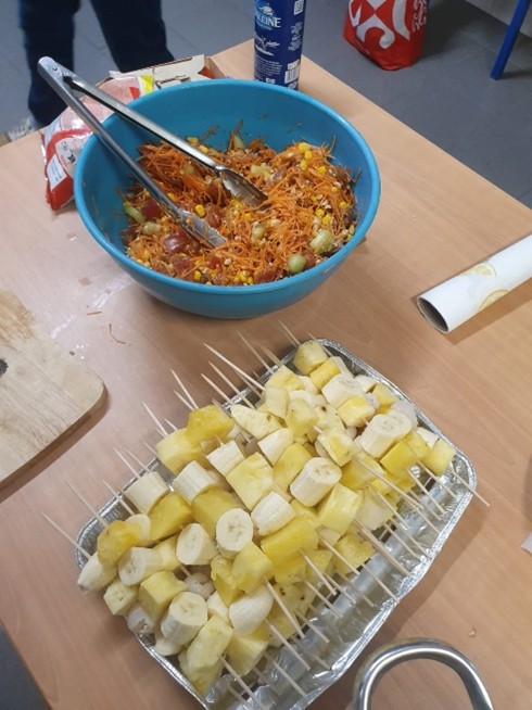La soirée est passée tellement vite après cela !! Nous avons mangé notre repas africain préparé tous ensemble, puis nous avons installé nos couchages dans le gymnase, sommes allés nous laver les dents, et fait une toute petite veillée car il était déjà tard. Une belle histoire et deux ou trois chansons, et le marchand de sable est passé. C’était une super soirée et une super nuit !! Aucun de nous n’a pleuré !! Nous étions bien tous ensemble !!